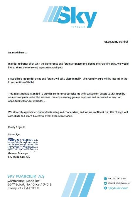 Выставка литейного производства Турции 2025 пройдет с большим размахом в Стамбульском международном выставочном центре с 24 по 27 сентября 2025 года. Мы давно ждали встречи с вами на этом ключевом отраслевом мероприятии, где мы сможем вместе изучить передовые технологии и тенденции развития литейной отрасли.
